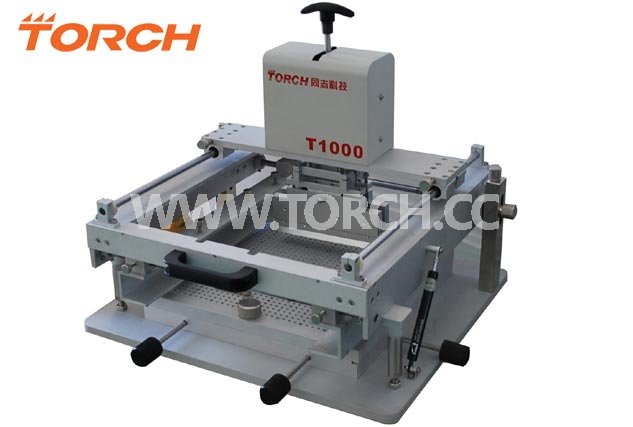 3、抬起印刷模板,取出PCB板,完成PCB板上焊盤(pán)的錫膏印刷過(guò)程,F(xiàn)有的全自動(dòng)印刷機(jī)中帶動(dòng)刮刀水平運(yùn)動(dòng)的傳動(dòng)裝置主要通過(guò)兩個(gè)相互平行的導(dǎo)軌配合高精密滾軸絲杠傳動(dòng),利用絲杠旋轉(zhuǎn)實(shí)現(xiàn)刮刀在水平方向的移動(dòng),其方式既有效保證了刮刀水平運(yùn)動(dòng)、平穩(wěn)運(yùn)行的要求,而且印刷出的焊點(diǎn)均勻、可靠;手動(dòng)印刷機(jī)一般采用橡膠刮刀,人工控制刮刀速度,角度和壓力。但是隨著電子行業(yè)的飛速發(fā)展,集成度越來(lái)越高的芯片不斷出現(xiàn),對(duì)印刷機(jī)的印刷精度提出的很大的挑戰(zhàn),特別是對(duì)于小型手動(dòng)印刷機(jī)來(lái)說(shuō),行業(yè)中還停留在“沙模鑄鋁”和“純手動(dòng)操作”階段,第一,平臺(tái)的問(wèn)題滿足不了高精密的絲網(wǎng)印刷,第二,純手工的刮刀操作,使刮刀的角度,刮刀的壓力,刮刀的移動(dòng)速度等都變得不可控,第三,精密印刷的一致性也不能保證,所以,T1000手動(dòng)精密印刷機(jī)的出現(xiàn),解決了上述在手動(dòng)印刷領(lǐng)域不能解決的問(wèn)題。T1000手動(dòng)精密印刷機(jī)的出現(xiàn),使電子廠僅僅用較低的成本就享受到了高昂的半自動(dòng)或者全自動(dòng)印刷機(jī)才有的功能,有效減低了生產(chǎn)成本,提高了印刷效率和印刷質(zhì)量。