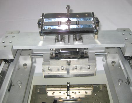 本機(jī)x、y、z和角度四軸都可以精密調(diào)整,通過(guò)調(diào)整四軸實(shí)現(xiàn)PCB板上的焊點(diǎn)和固定于模板框架上的模板相應(yīng)開(kāi)孔坐標(biāo)的一一對(duì)應(yīng),并通過(guò)平臺(tái)的上升下降調(diào)整PCB和模板之間的距離。