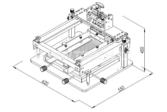 最大鋼板尺寸:350*450mm,模板框架寬度可調(diào),四點(diǎn)定位平面,保證PCB板和模板的水平度。