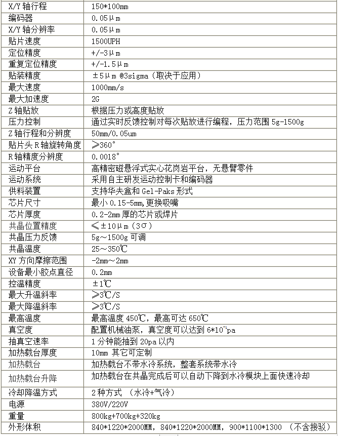 1、適用于半導體集成電路生產(chǎn)過程(后道封裝)中片式元器件貼裝,也可實現(xiàn)功率芯片與封裝器件自動裝配功能、可自動貼裝、共晶、點膠、蘸膠、粘片、晶圓粘片、倒裝、GaAs,粘片壓力可編程控制,精度高。 2、采用精密磁懸浮運動平臺,主系統(tǒng)X、Y軸采用帶有高解析度直線編碼器的無接觸無摩擦 磁懸浮系統(tǒng)。編碼器刻度達0.02μm精度,可實現(xiàn)高速、精密、亞微米級的定位。 3、平臺的設計采用高穩(wěn)定的花崗巖一體化高速運動平臺,使KV800在保證熱穩(wěn)定和機械穩(wěn)定 的同時,實現(xiàn)高速啟動時間和+/-0.5μm乃至更好的貼片精度,從而滿足高精密的應用要求。 4、具備獨立的點膠控制軟件進行膠水形狀和路徑的任意設置,可以實現(xiàn)點、線、平面、非 平面、弧形、圓形等任意形狀的點膠。同時配置獨立的點膠控制器。點膠控制器有獨立的算法, 膠水多的時候,氣體壓力會根據(jù)算法自動加大。膠水少的時候,氣體壓力會根據(jù)算法自動降低壓力。實現(xiàn)膠水點膠的一致性。 5、圖像識別系統(tǒng)包括兩組獨立的識別系統(tǒng)。頂部系統(tǒng)配置兩組獨立的工業(yè)相機,實現(xiàn)電路 板MARK點、焊盤的識別,底部系統(tǒng)配置超精密的工業(yè)相機,配置10種以上的圖像識別算法,可 以實現(xiàn)相關原材料包括特征點、管腳、芯片MARK點、異形件、小型基板等精密識別。 6、貼片機具備自動校準功能,在使用時可以根據(jù)要求設置多少次運動之后自動進行X Y軸運 動精度的校準,也可以在發(fā)現(xiàn)設備定位不準確時,通過三維自動校準進行運動軸的校準。同時通 過底部圖像識別系統(tǒng),進行點膠機點膠針頭和吸嘴的自動校準。 7、旋轉(zhuǎn)角度:設備配置高精密DD馬達,具備360度旋轉(zhuǎn)功能,旋轉(zhuǎn)分辨度為0.001度,可以實現(xiàn)組裝過程中任意角度的芯片貼裝。 8、設備配置精密點膠機,通過軟件可以選擇用點膠1或2