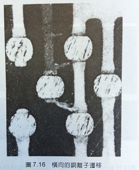 如果同一層導體層內產生銅離子遷移時有可能的原因是樹脂特性以外的因素所造成的結果,例如圖7.16為去除晶片的線路板接合部分表面,由照片可以看到中間的三條線路間有產生銅離子遷移的現象,這些導線之間的最小線距為65um,因此銅離子遷移的現象不只發(fā)生在距離只有40um的相鄰導線層間也會發(fā)生在線距65um的相鄰導線之間。