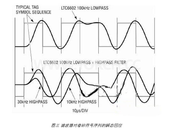 比較具 10kHz 和 30kHz 高通設(shè)置的濾波器輸出,10kHz 輸出的訊號(hào)躍變和時(shí)間間隔對于檢測符號(hào)序列而言是足夠的 (在 RFID 環(huán)境,噪聲將重迭在輸出訊號(hào)上)。總的來說,提高低通 fCUTOFF 和/或降低高通 fCUTOFF 意味著,以增大濾波器輸出噪聲為代價(jià)“提高”訊號(hào)躍變和時(shí)間間隔的“質(zhì)量”。