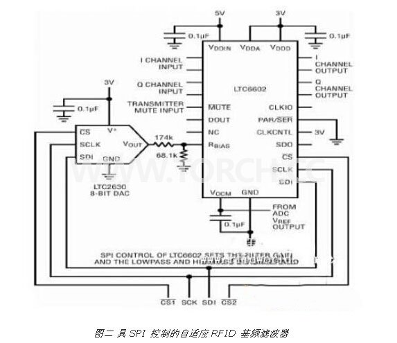 圖二顯示了一個(gè)簡單和基于 LTC6602 的濾波器電路,該電路用 SPI 串行控制來改變?yōu)V波器的增益和帶寬,以適應(yīng)一套復(fù)雜的數(shù)據(jù)速率和編碼。(反向散射鏈路的頻率范圍為40kHz 至 640kHz,而數(shù)據(jù)速率范圍為 5kbps 至 640kbps。)